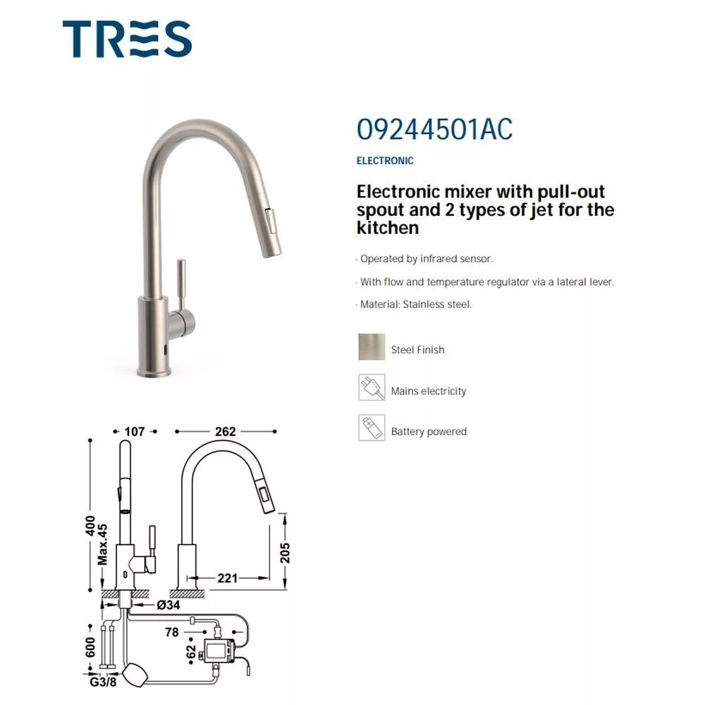 Tres elektronikus mosogató csaptelep kihúzható fejjel, rozsdamentes acél