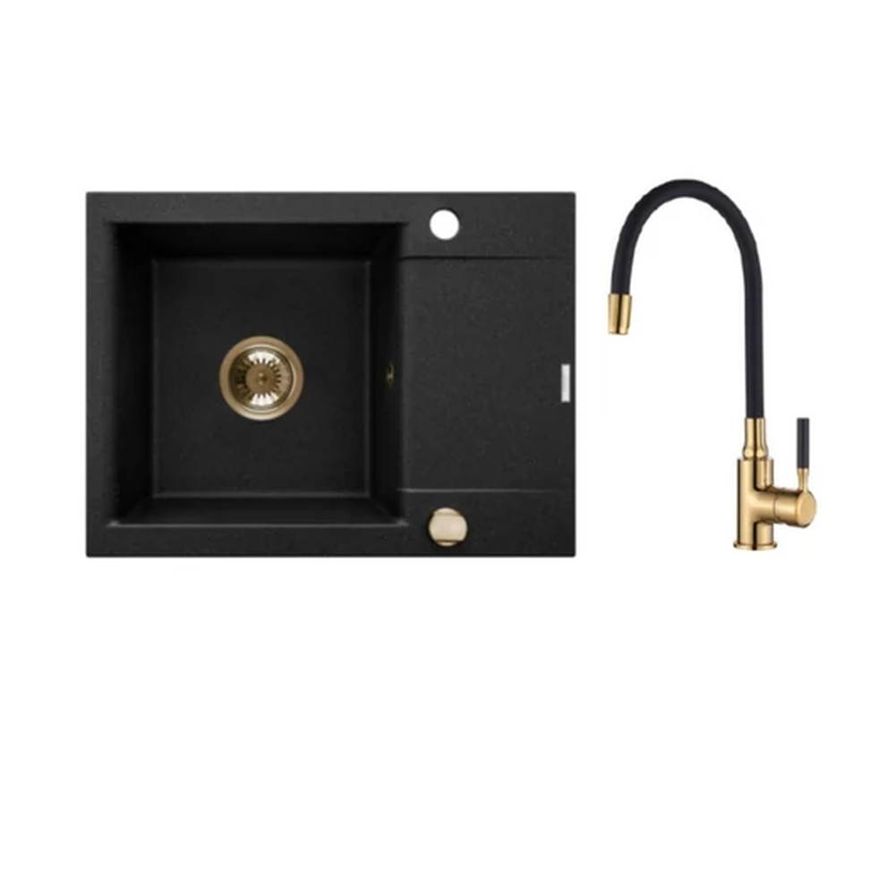 Invena TESALIA gránit mosogató, 1 medencés, rövid csepptálcás, GLAMOUR csapteleppel, fekete-arany